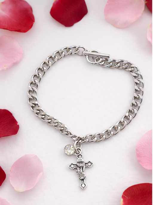 Catholic Gifts CanadaThis pretty bangle style bracelet features a First Communion Cross along with a Miraculous Medal and a clear gem stone. This bracelet is adjustabl...