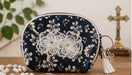 This zippered rosary case is designed to gently protect your rosary while keeping it beautifully close at hand. Finished with a delicate lace flower appliqué, a silver cross detail, and a white tassel with zipper keychain, it blends practicality with quiet devotional elegance.